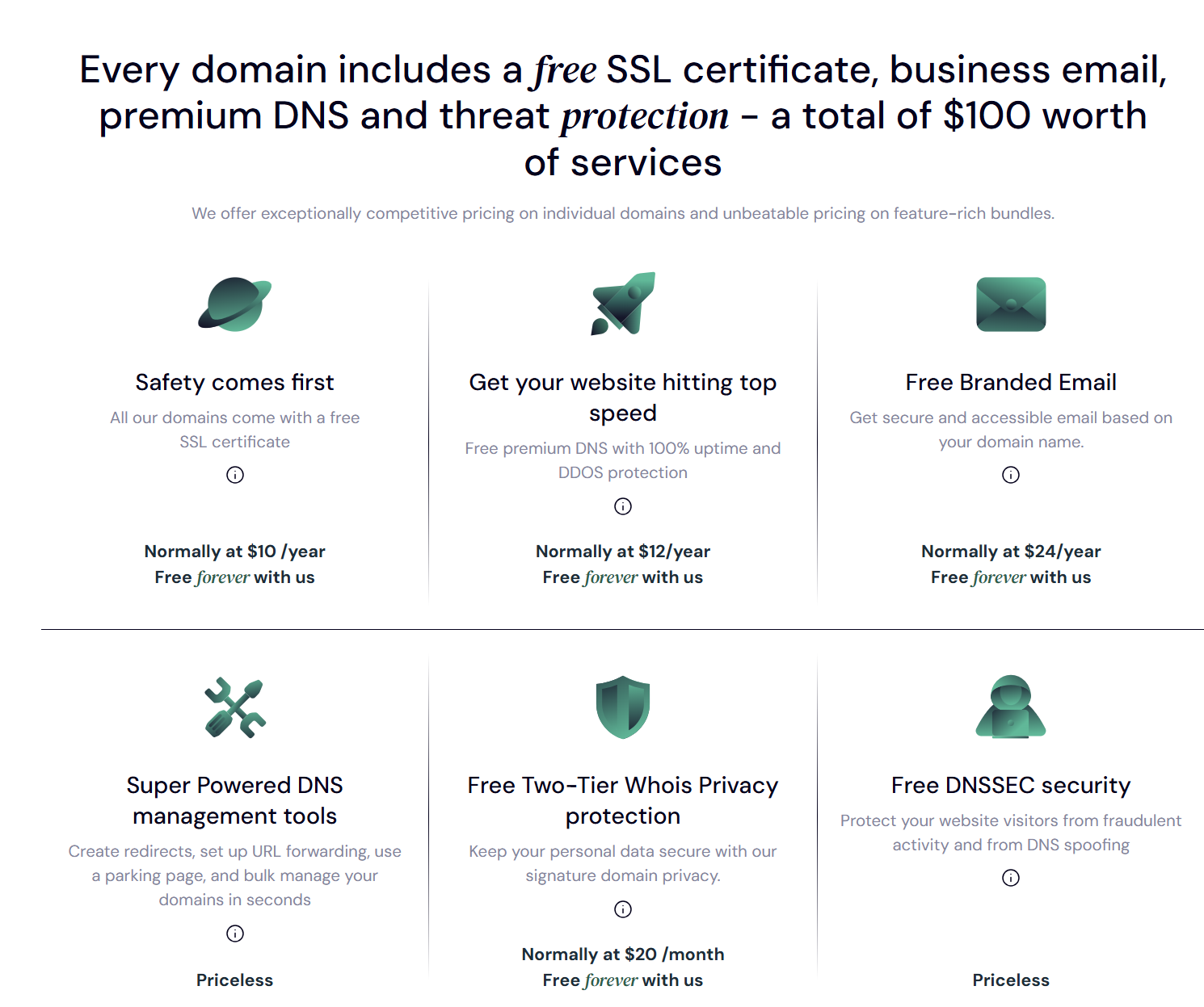"Every domain purchase includes over $100 in bundled services, featuring a promo code for a 1-year SSL certificate, a 60-day branded email trial, and free lifetime privacy protection."