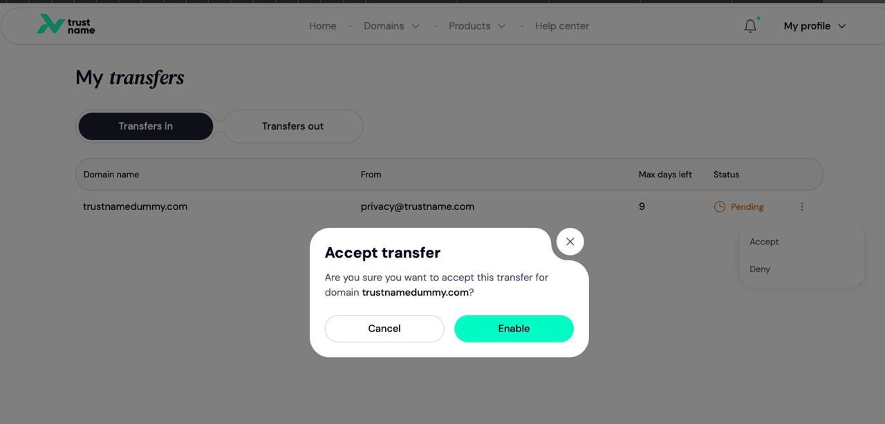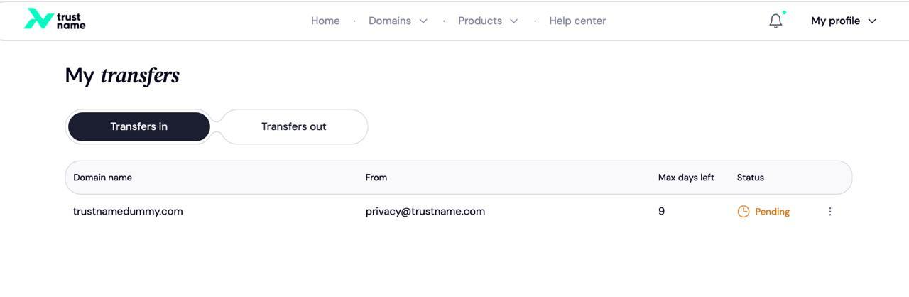 To accept the transfer, the new owner must log in to the Trustname account using their credentials. Next, they’ll navigate to ‘Domains >> Transfer >> My Transfers.'.