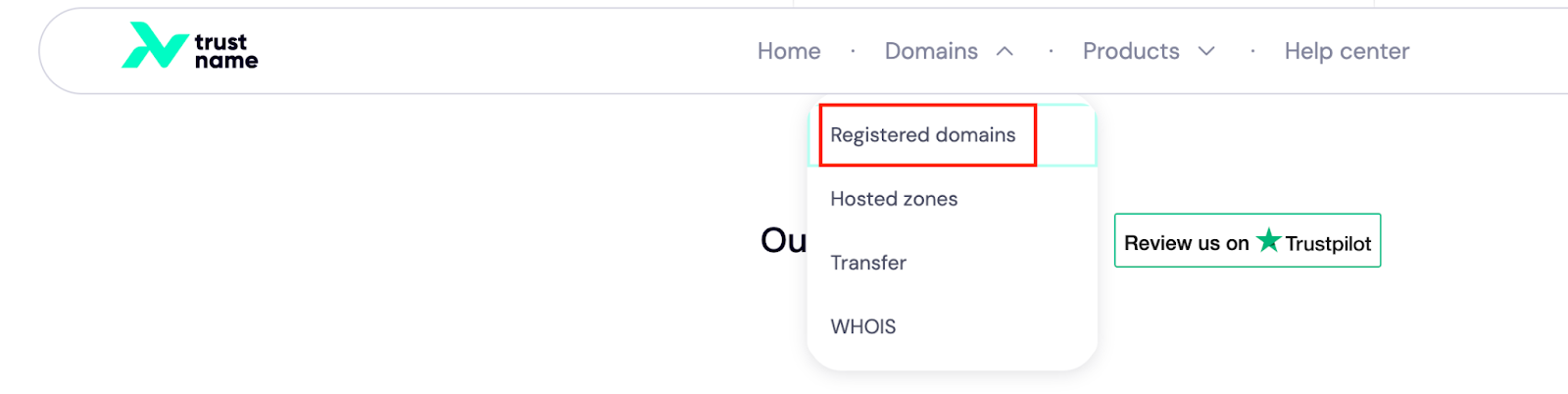 - Once logged in, click ‘Domain’ on the navigation bar. You’ll see a drop-down menu; click ‘Registered domains’ to see the list of all your registered domain names