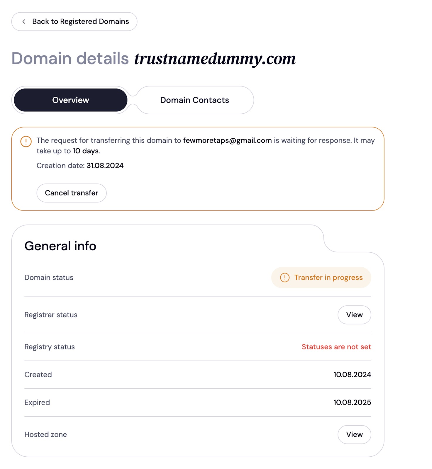 Before the new owner accepts the domain, they’ll receive a pending transfer status