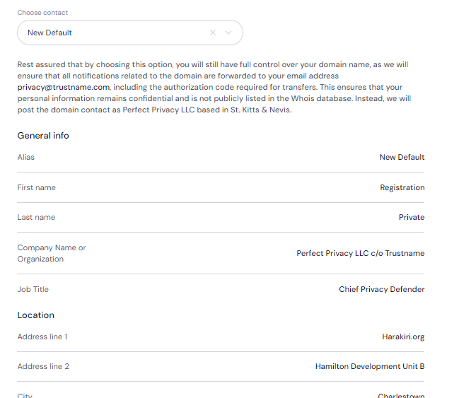 If you have TrustnameS Two-Tier WHOIS Privacy enabled, then the registrant details linked to the domain will be those of Perfect Privacy LLC, the proxy service we are partnered with. While the company is listed as the official registrant on paper, you retain full ownership of the domain.