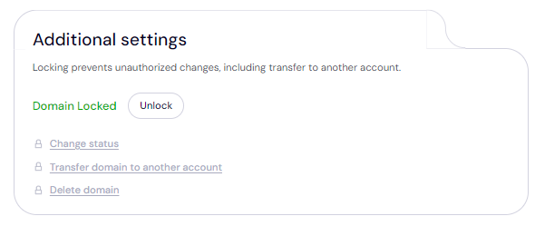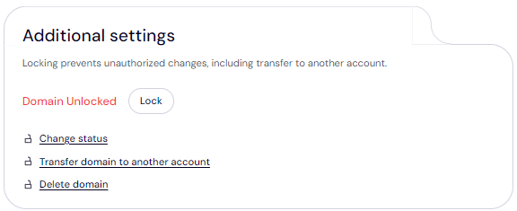 - Scroll down to ‘Additional settings’ and check the domain lock status. If your domain is locked, you’ll see ‘Domain Locked’