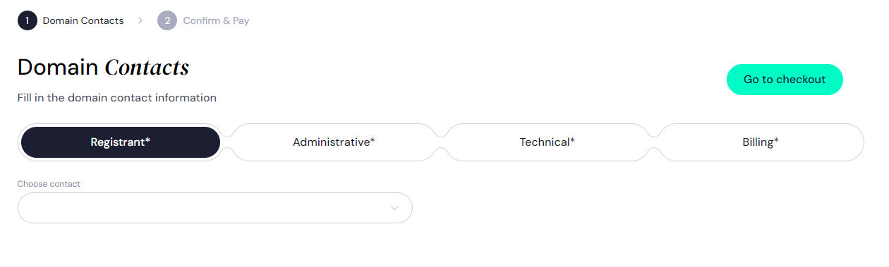 You’ll be required to fill out details for the registrant, administration, technical, and billing.