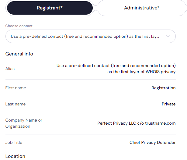 Alternatively, under Contact Info, you can click on ‘Use a pre-defined contact’ and we’ll register your domain name in the name of Perfect Privacy LLC, our partner proxy company. This ensures the utmost privacy, as your contact details will never be made public in the WHOIS database.