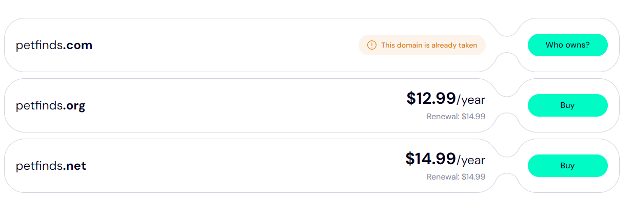 In the photos above, the ‘petfinds.com’ domain was taken, but the search engine suggested the same domain with the ‘.org’ and ‘.net’ top-level domains (TLDs), both of which are available.