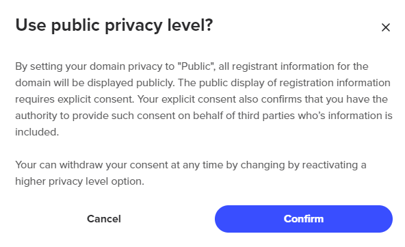 so click on 'Public' to disable privacy remember, this is only temporary and we will automatically shield your domain once we receive it from Spaceship. - Click on 'Confirm' to disable it and apply your changes.
