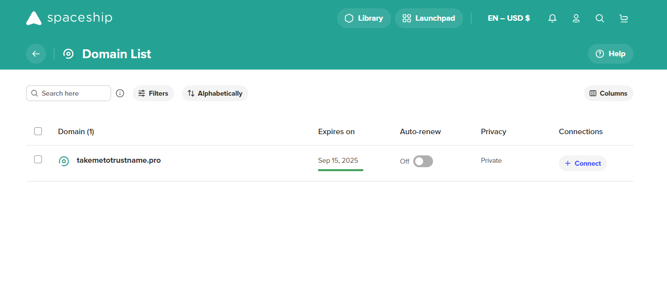 Click on the 'Domain' you want to manage, and all your core settings are right there after your second click. You can see your domain status and important dates, generate your Auth code, tweak your nameservers, set up auto-renew, enable DNSSEC, and manage your transfer settings all on the same page.[+] [Callout] Default Insert title here [+] [Callout] Title/Title with Icon -> On Spaceship, you'd need to access the 'Launchpad', scroll down to find 'product and tools', then click on your domain list, before you can access important settings on your domain. Trustname simplifies managing with just 1-click.
