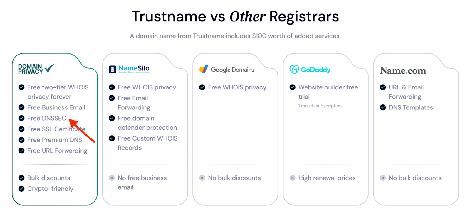 Instead of charging extra fees for premium security features like DNSSEC, SSL certificates, Whois Privacy Protection, branded email, and DDoS protection, all Trustname users enjoy these for free — forever!