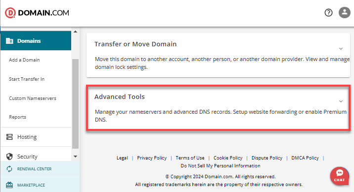 - Account Manager >>>Domains. Ensure the correct domain is selected, then scroll down to the Advanced Tools section and click on it.