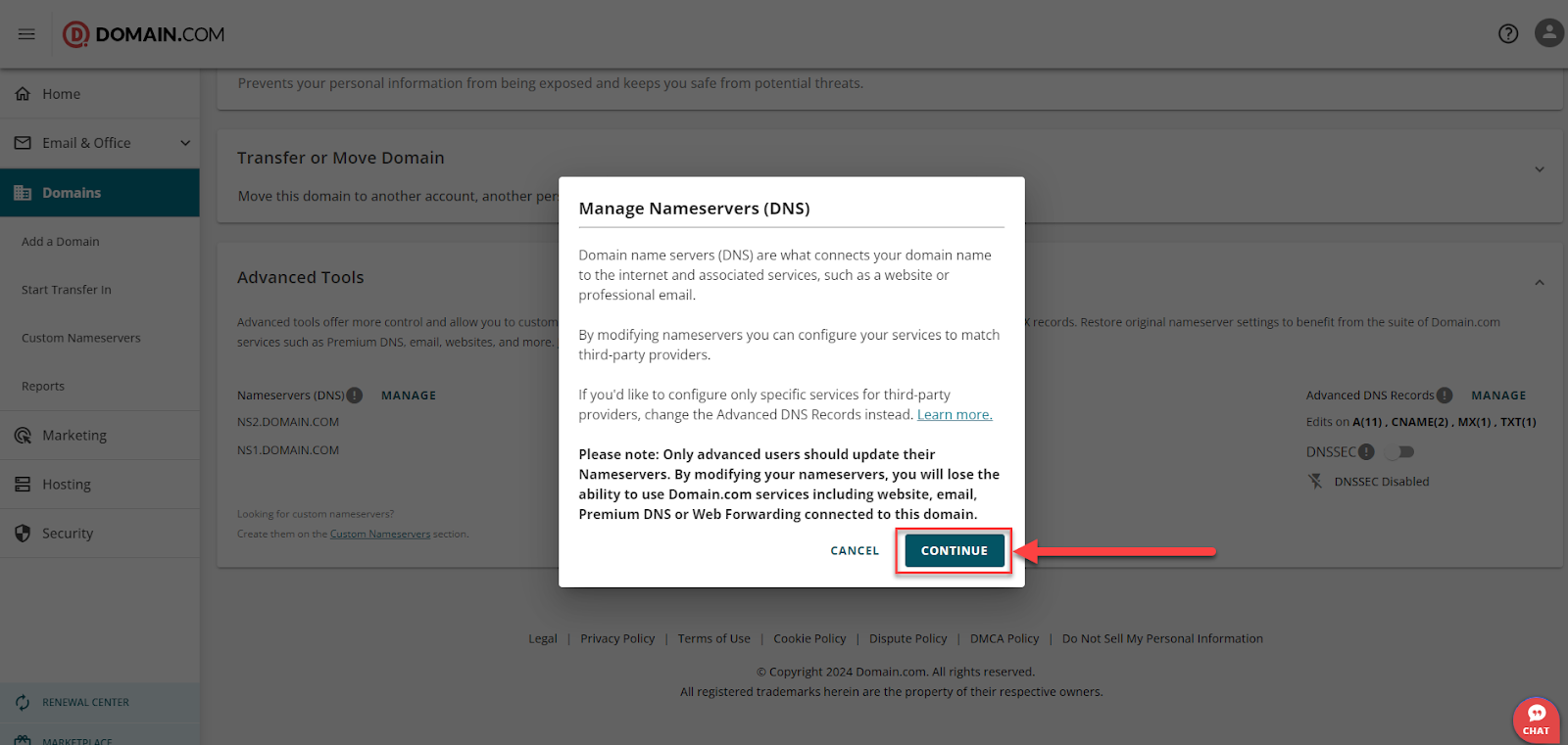 - In the pop-up window titled Manage Nameservers (DNS), click 'Continue'.