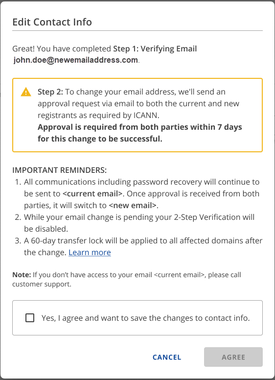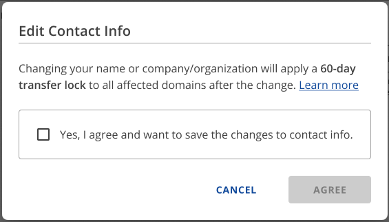 You'll be notified that a 60 days transfer lock will apply. Confirm by selecting the checkbox and clicking 'Agree'.