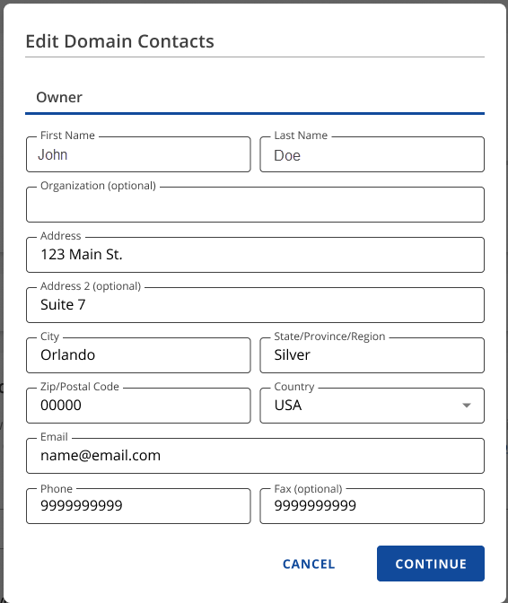 If you're changing the address, phone, or fax number: In the Edit Domain Contacts pop-up window, make your changes and verify their accuracy.