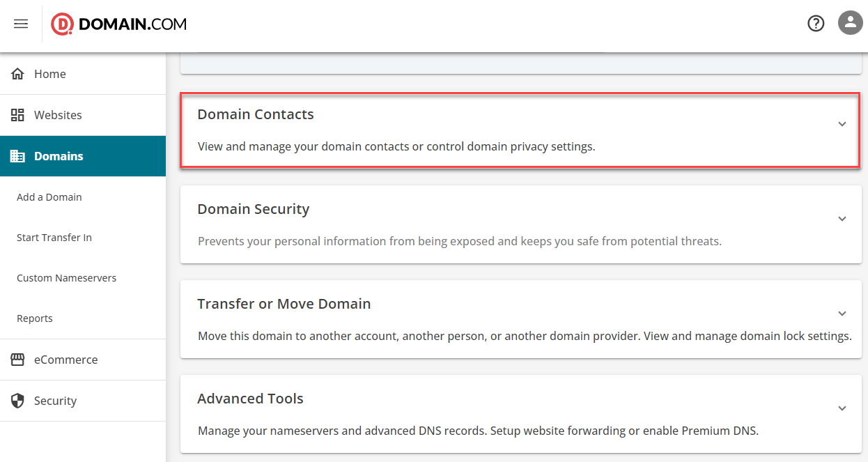 - Locate Domain Contacts and click the dropdown arrow on the right.