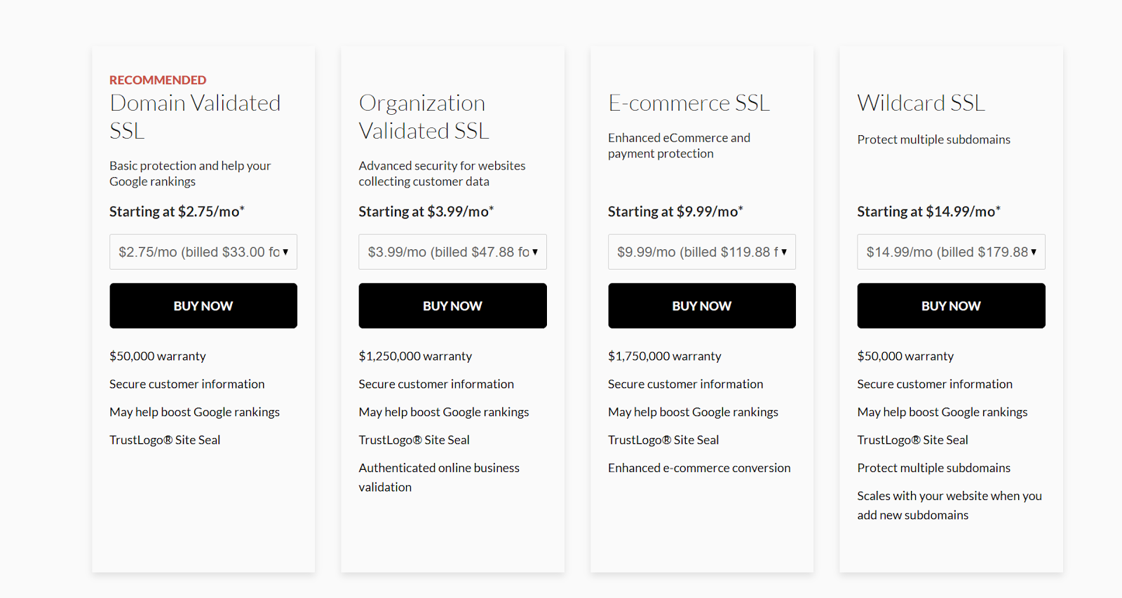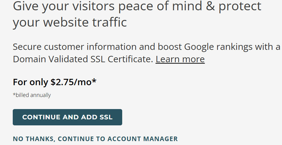 You will have to purchase an SSL certificate and a business email separately from Domain.com. Depending on the type of SSL certificate you need, you spend an additional $2.75 to $14.99 monthly.