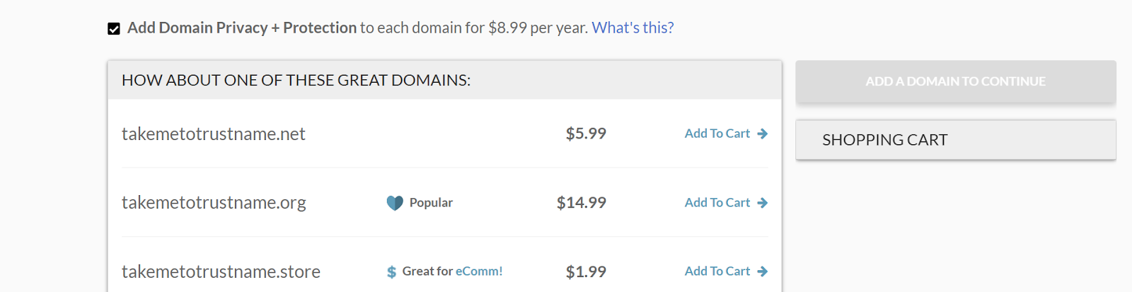 Your total is now $164.87 for one year. How does Trustname measure up? Hold your breath.