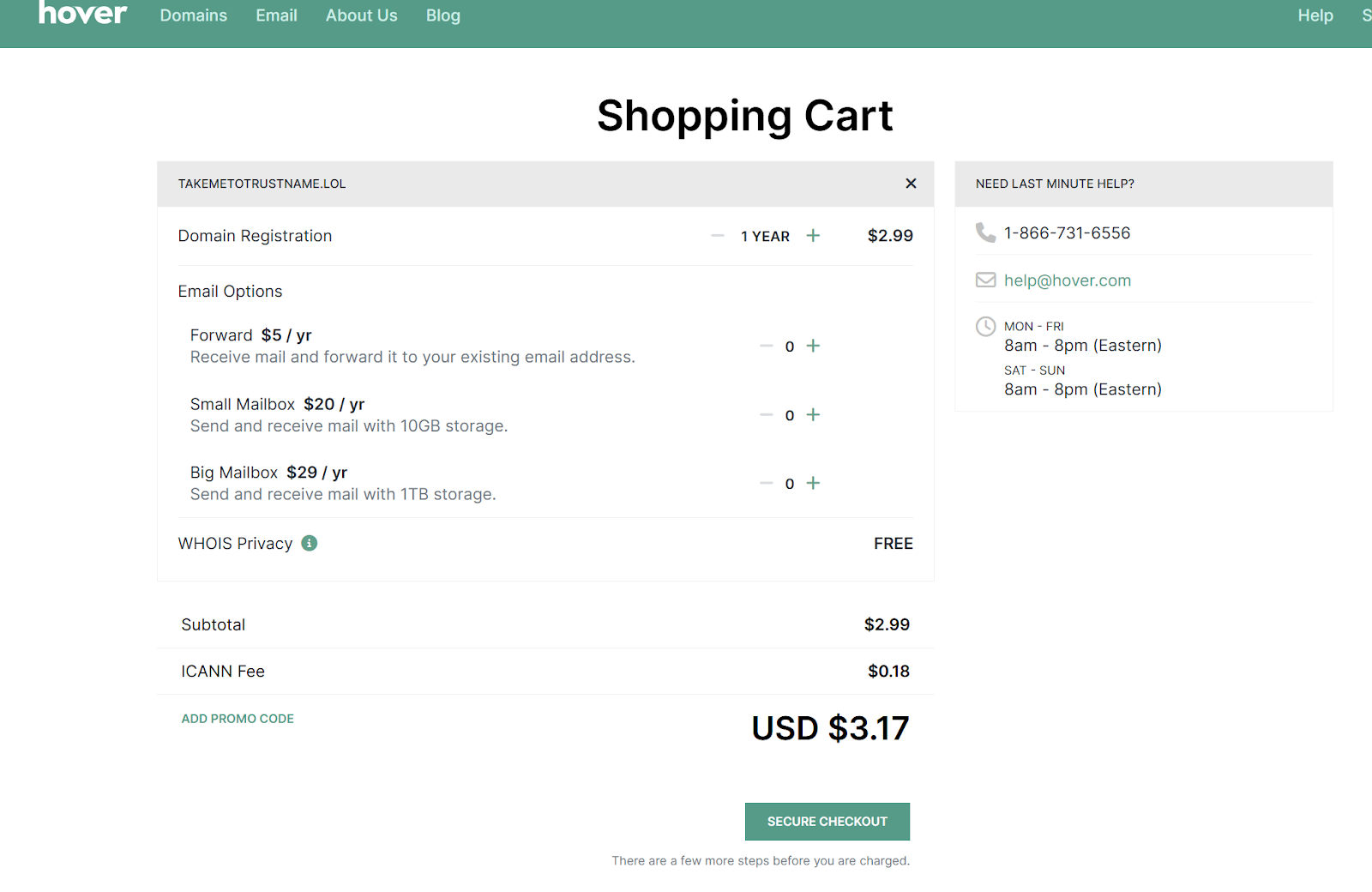 While Hover offers Whois privacy service for free, you more than make up for it in the domain renewal price you pay. Additionally, if you need an email service to connect to your domain, you pay between $5 $29/yr for email service.