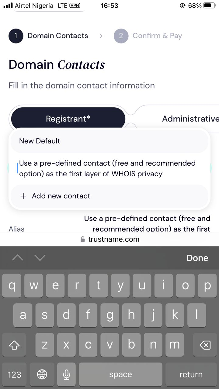 - Opt for maximum privacy with Trustname's Two-Tier Privacy Protection by selecting 'Use a pre-defined contact'.