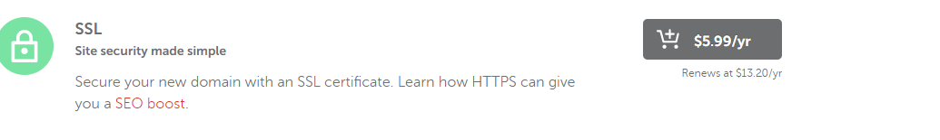 An SSL certificate also costs $5.99/yr, renewing at $13.20/yr.
