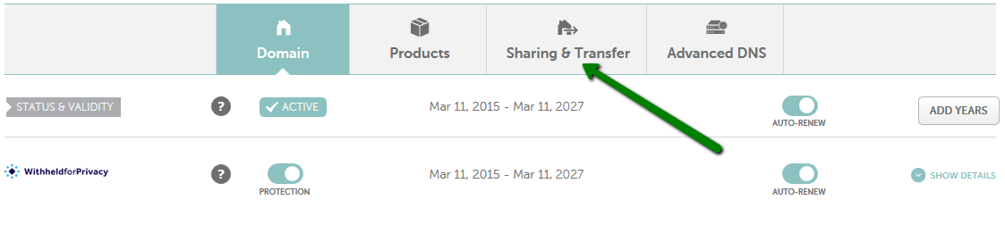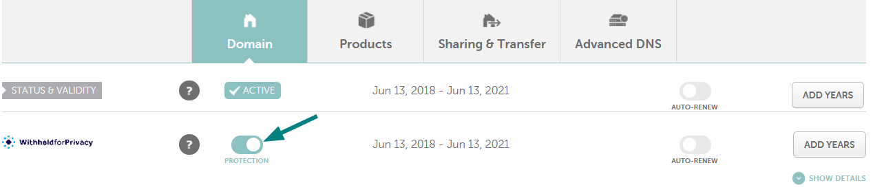 Then click the 'Protection' button next to 'Domain Privacy' to turn it off.