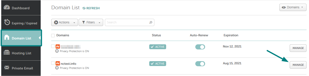 Back to the Domain List bar, click the 'Manage' button next to your domain.