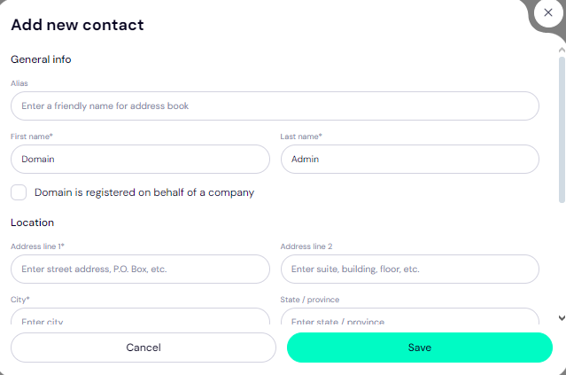 - Fill in your domain contact details. You can choose to use your own details by clicking on the 'Choose Contact' dropdown and selecting 'Add New Contact'.