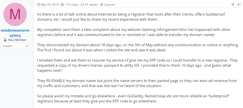 Do you run a 'grey-area' business or a brand in a sensitive niche? You should run over to Trustname if you want a truly bullet-proof registrar. Internet.bs customers complain about having their domains shut down due to abuse reports from scammers and competitors.
