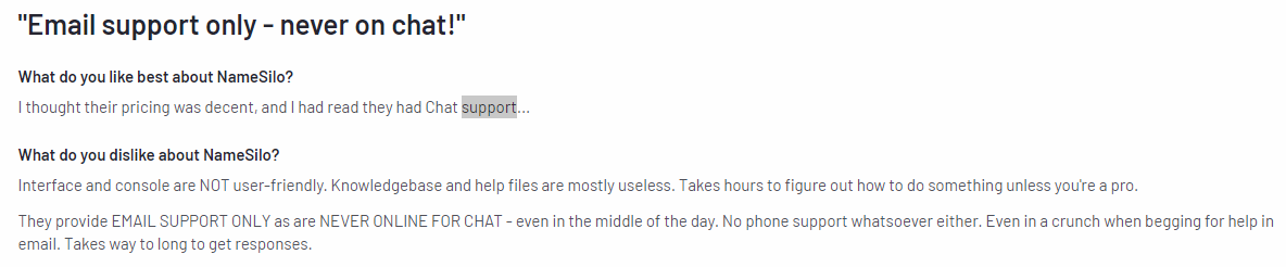 A big con of Namesilo is its incredibly poor support. Customers often complain about how their support agents don't know basic tasks or are outright rude when you make an inquiry. Also, their most active support channel is email when customers in fact want real-time communication e.g.: via live chat.
