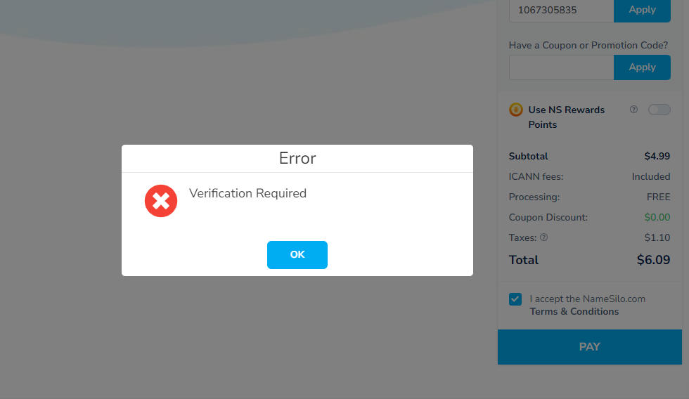Customers often complain about getting the 'Verification Required' prompt without any real solution.And after you purchase a domain name, you still see it in your cart.