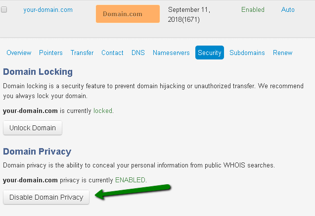 Click the 'Disable Domain Privacy' option to remove it.