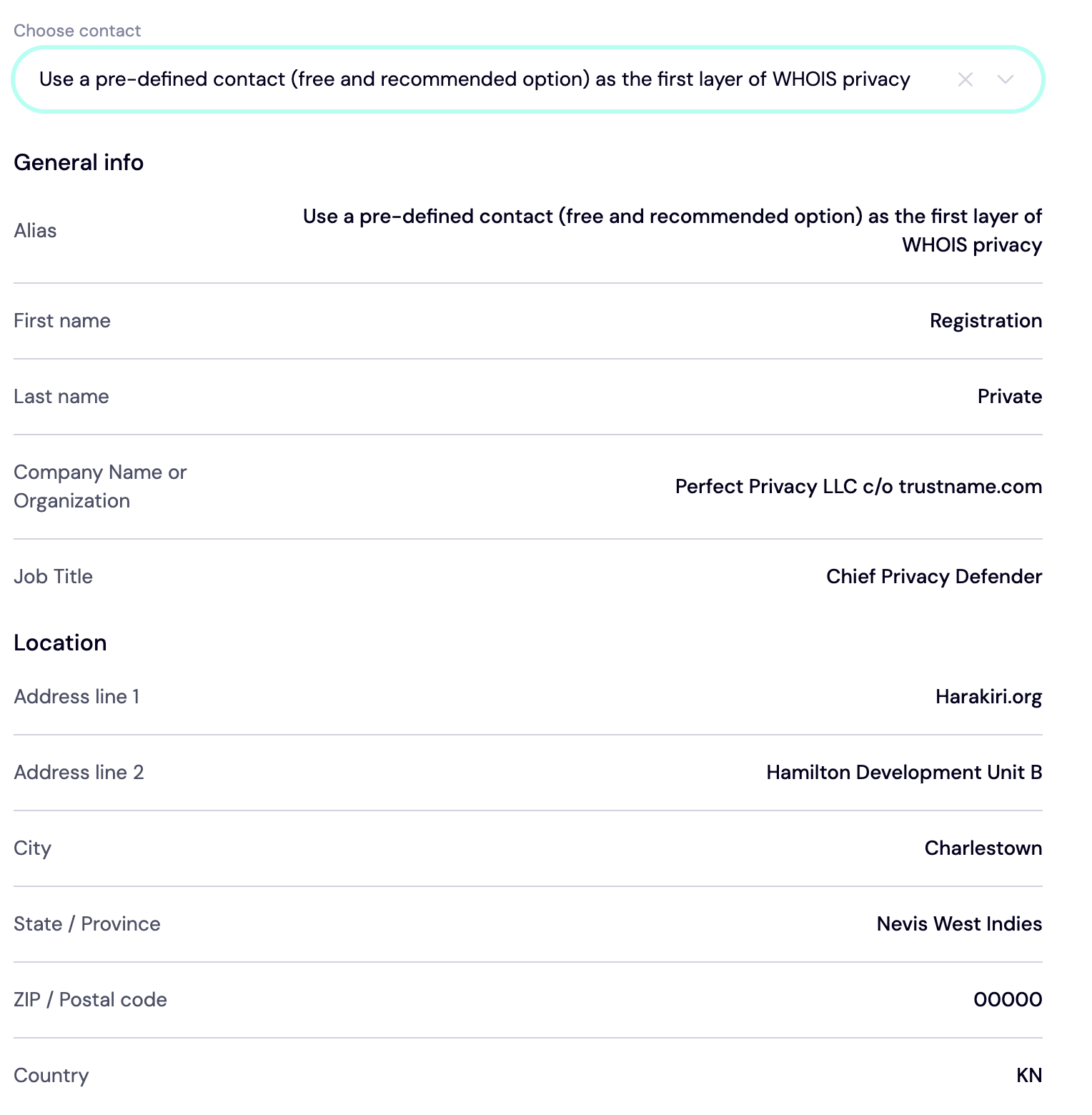 If you'd rather use our Two-Tier privacy protection, click 'Use a pre-defined contact' and your contact details appear like this.