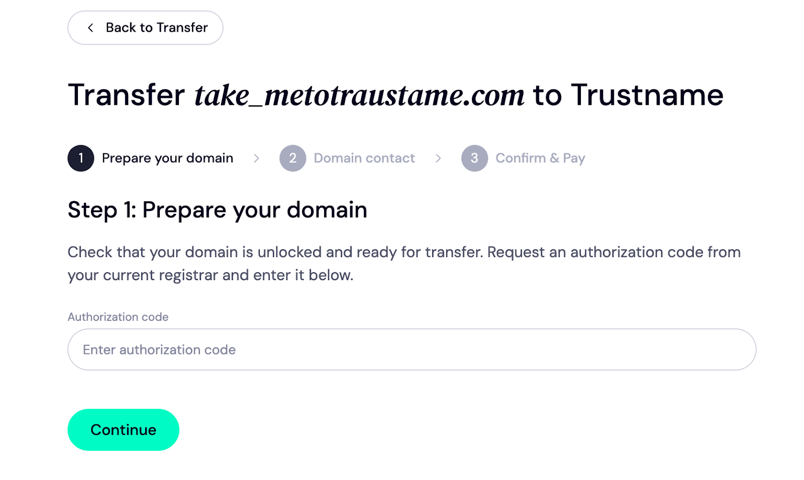 - The auth code you pasted into the Trustname transfer portal is correct.