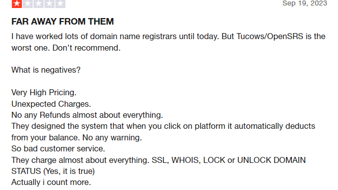 Customers on Tucows complain about how high the prices are. The prices for their domains are above market rates, and they receive unexpected charges on their cards. They don't offer refunds for almost all purchases on the platform, and you have to pay for domain essentials like SSL certificates and Whois privacy.