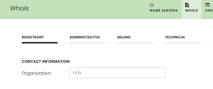Here, you will be able to review your registrant, administrative, billing, and technical contacts. Your focus should be on the 'REGISTRANT' tab. Review your email address and your contact details to make sure they're up to date.