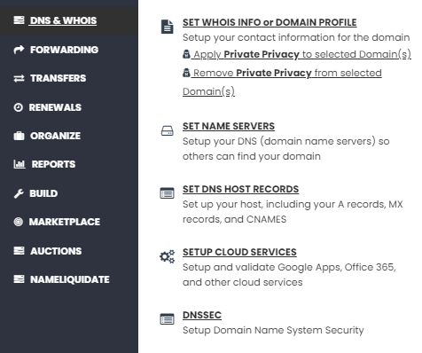 Under 'DNS & WHOIS' click on 'SET WHOIS INFO or DOMAIN PROFILE' to review the contact details linked to your domain: