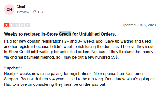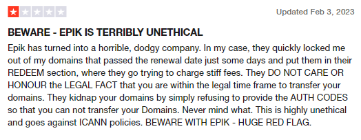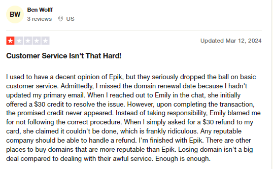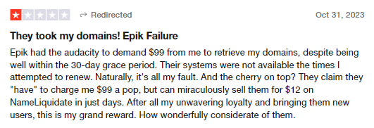 As an extension of the above point, Epik has also been known for its ultra glitchy payment system. Customers complain about getting charged without having their domains added to their accounts and for failed transactions, Epik refuses to refund the money but forces to accept in store credits.