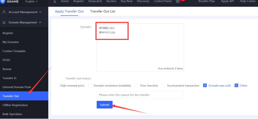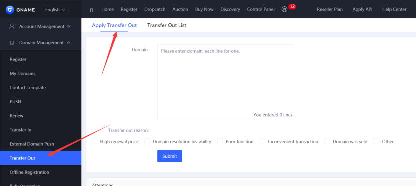 - Go to Domain Management >>>Transfer Out.